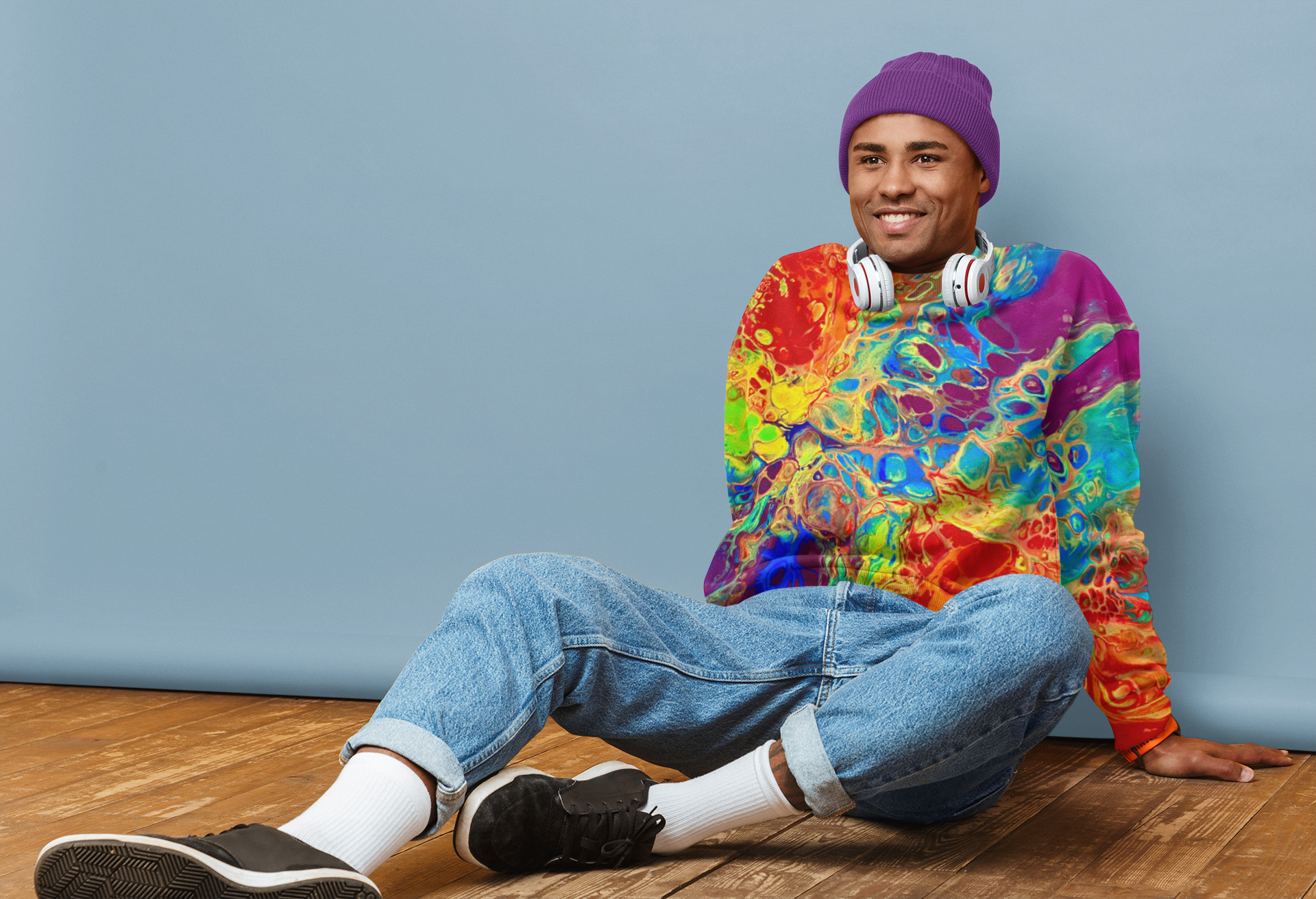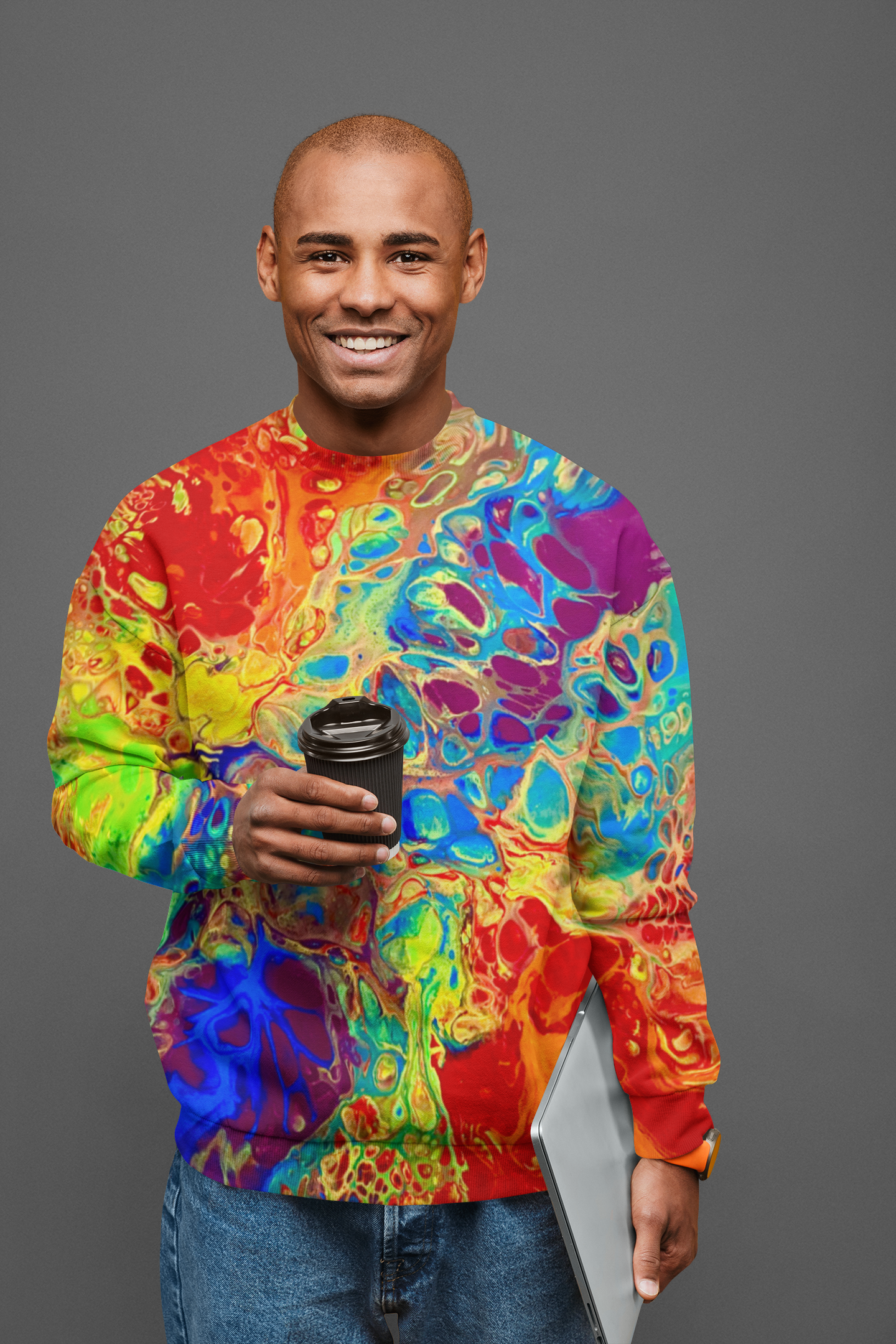 This vibrant crew neck sweater brings bold color and fluid movement to everyday wear. Bright swirls of crimson, cobalt, and sunflower dance across the fabric like poured paint, creating a wearable work of art that feels lively and spontaneous. Lightweight with a touch of stretch, the sweater drapes easily over layers or stands on its own as a statement piece. It fits into a creative wardrobe for people who love color, studio nights, gallery openings, and city strolls that refuse to be ordinary. Wear it when you want your outfit to spark conversation and echo the freedom of hands-on making — messy, joyful, and completely personal.