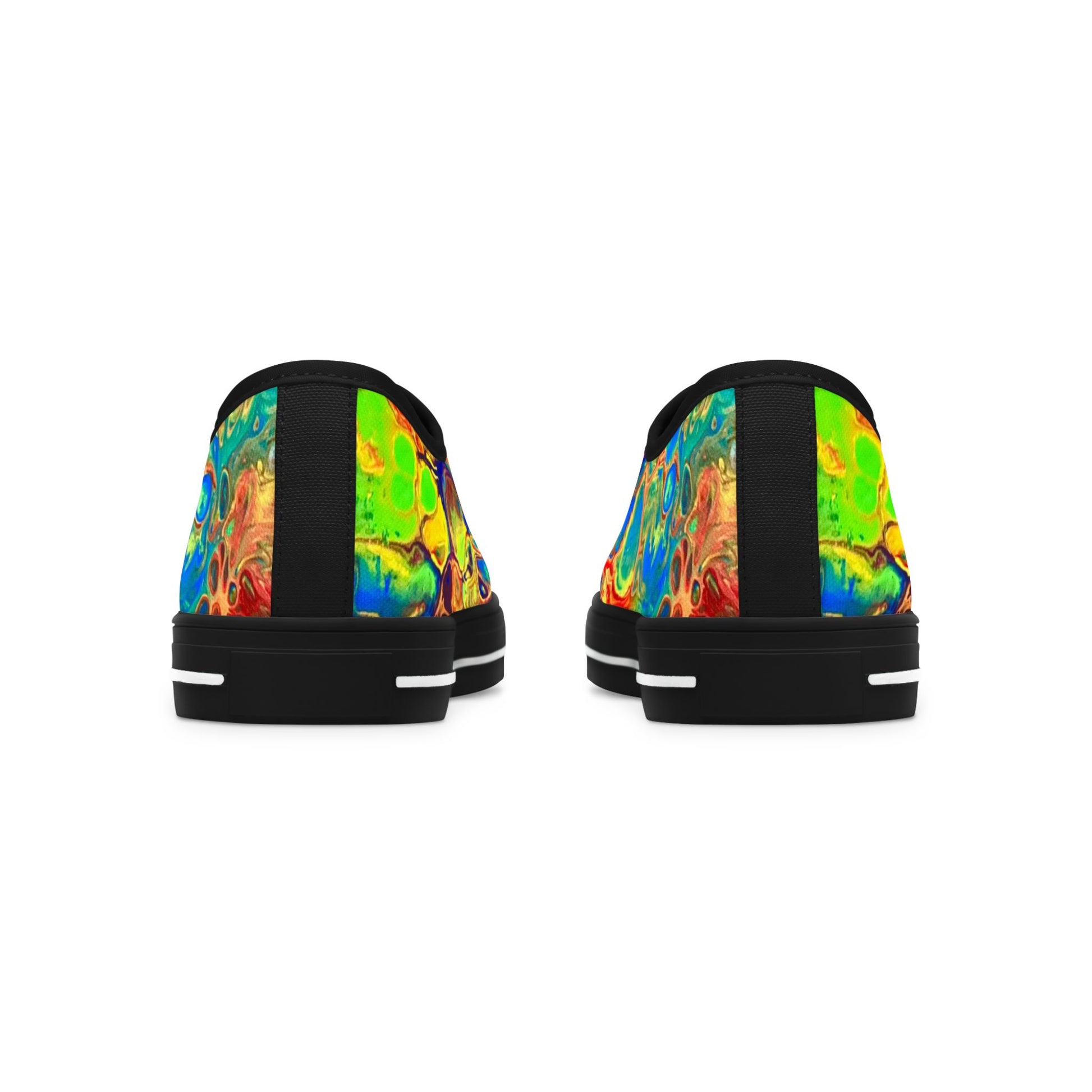 Low-top sneakers that turn every step into a colorful statement. The full wraparound print bursts with iridescent, liquid-like patterns that catch light and attention. Built on a lightweight EVA sole with shock-absorbing insole and durable rubber outsole, they feel springy underfoot. The 100% polyester canvas upper is breathable and soft, with PU leather details and a reinforced pleather toe for long-lasting wear. Silver metal eyelets, memory foam deodorant insoles, and a foamed lining add comfort for all-day outings. These sneakers pair with relaxed denim, festival looks, or any outfit that needs a vibrant lift.